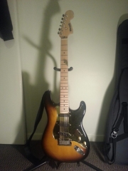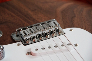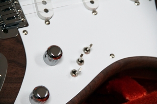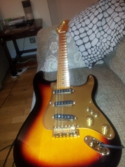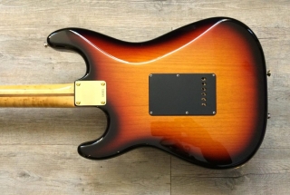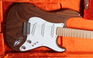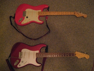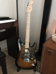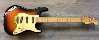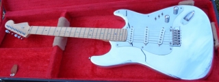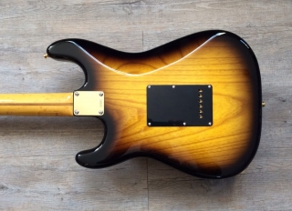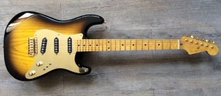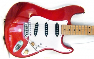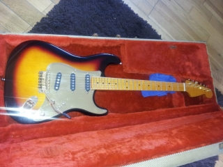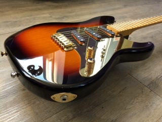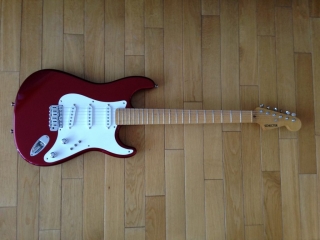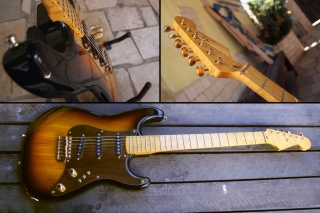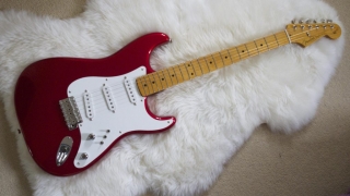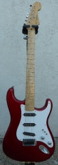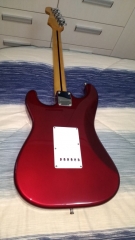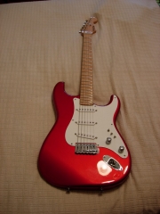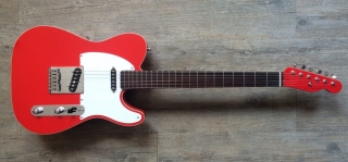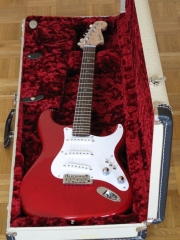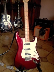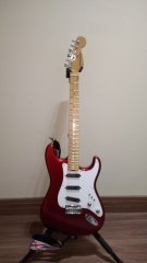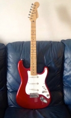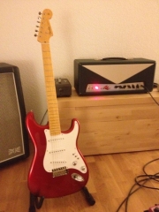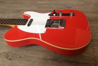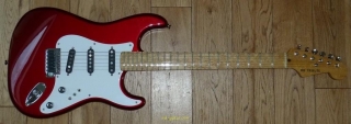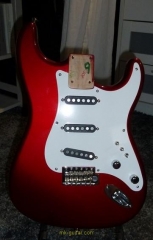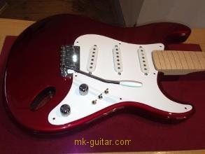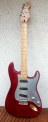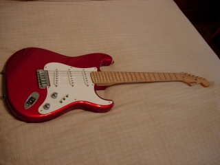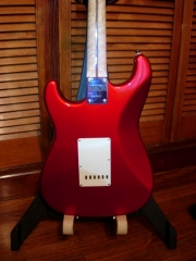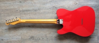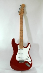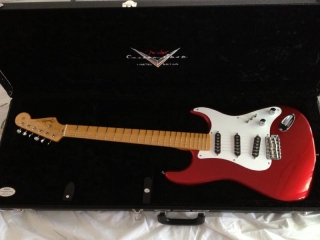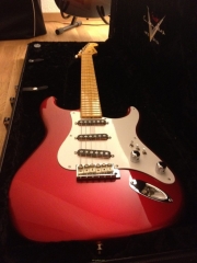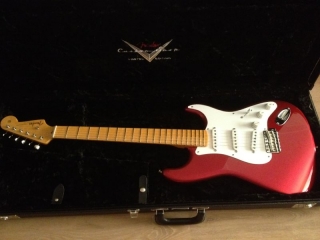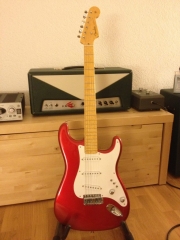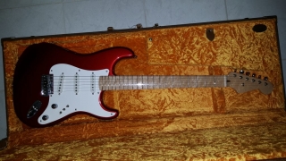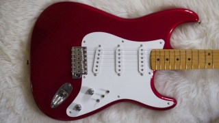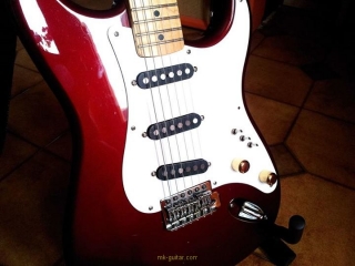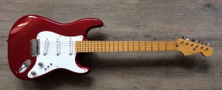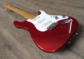 In my case, my replica is based on a Fender Custom Shop order. I ordered the guitar based on a Time Machine 57 NOS, Candy Apple Red over a gold base coat, bird eye maple neck with 12″ radius, 6105 frets and C-shaped. The guitar is nitro finished.