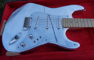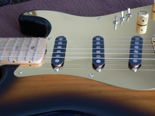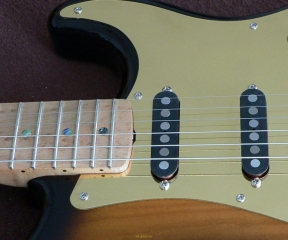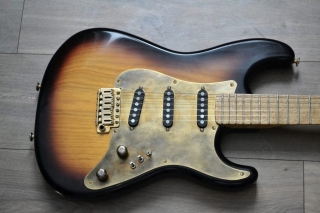 This page is meant to show all the beautiful guitars that people have built with my loaded pickguards , or the Dream Machine tremolos, or similar stuff. Some built themselves a replica of one of Mark Knopfler’s guitars, like the red Schecter Dream Machine, or one of the sunburst Schecters with a brass pickguard. Or they simply put it on any of their Strats to get that Schecter sound, or simply the possibility of the 26 sound combinations those three mini switches give you.